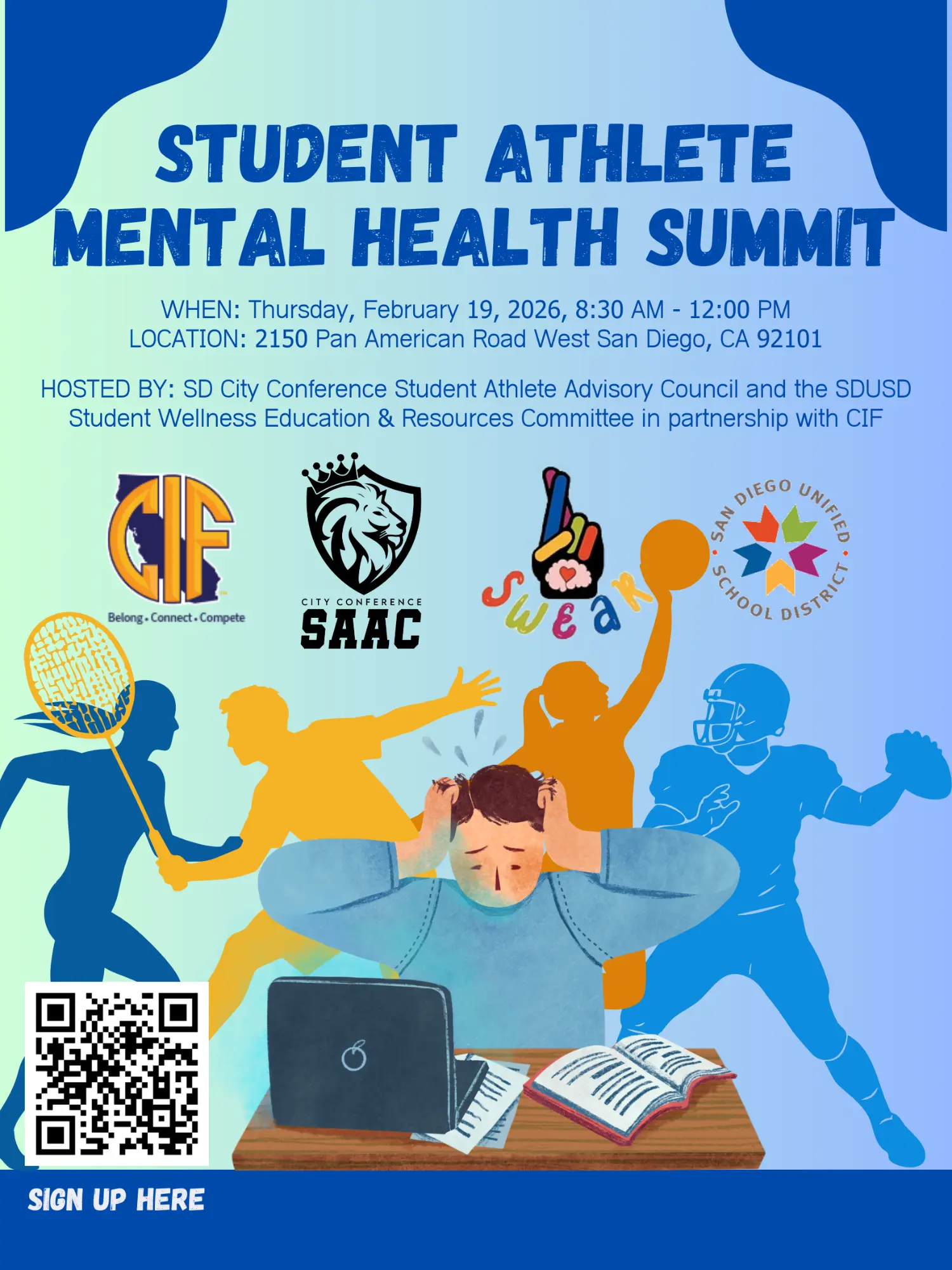 Student-Athlete Mental Health Summit 2026 Recap April 2, 2026 The Student-Athlete Mental Health Summit, hosted by the San Diego City Conference Student-Athlete Advisory Council and CIF, brought together high school student-athletes, coaches, and community leaders for a meaningful day centered on the importance of prioritizing mental health in high school athletics. The summit featured a keynote presentation from Alicia Guerrero, an SDSU student-athlete panel, and interactive workshops focused on topics such as performance pressure, identity, balance, and coping strategies. The event fostered a supportive space to normalize conversations surrounding mental health and emphasized the importance of caring for the whole athlete, on and off the court/field.